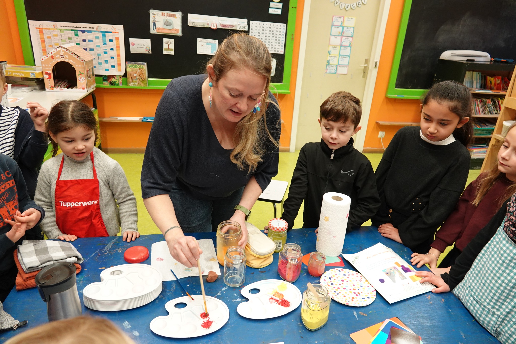 Dans le cadre d'un projet PECA, Virginie de l'EMA est venue nous faire découvrir la peinture à la préhistoire et nous apprendre une nouvelle technique de peinture à l'œuf.